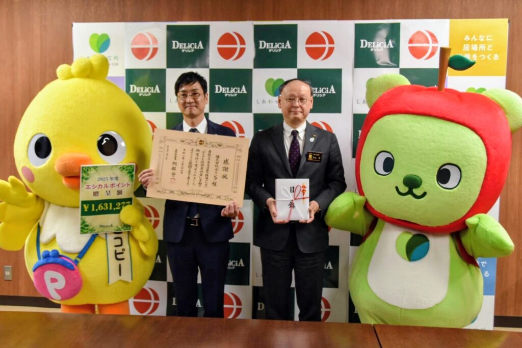 株式会社デリシア様と長野県とのエシカル消費の推進に向けた連携協定に基づく取組の一つである、「エシカルポイント」※によって集められた寄付金を贈呈いただきました。